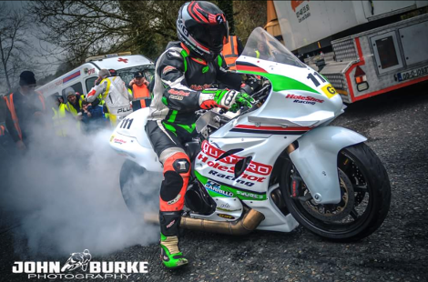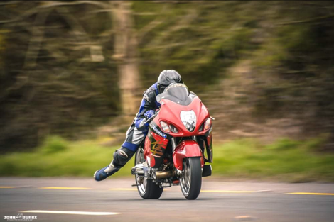 Going back the order then Class C took to the line in the last 4 pairings with James Royal showing the way. Pre -injection Class CA was led by the 2 Jacks Kelly and Dynan and they would inevitably meet in the final 4. Class D saw some great Club rivalry with Donal O’Donovan and Adrian O’Driscoll pulling through to semi-finals. Class E machinery always throws up some beautiful machinery from yesteryears and Ollie Leahy topped the EA sheets on his 1984 1100 with Mick “Basher” Healy not far behind onboard his 1982 Katana knocking out Ray Foley and Aaron Durnin respectively. In Class E Stephen Murphy set up a final against Mark Quilligan with his unmistakeable t-shirt telling us to “Burn Rubber not Your Soul!” Class F was heating up and Kieran Kelly now dipped under the 10 seconds, Stefan Georgiev, Eltan O’Hea and Johnathan O’Brien onboard the Panigale all progressed too. The knockout stages for G Class were limited to 3 pairings as Adrian Dorgan received a bye as Eric Sheehan’s Hayabusa experienced some mechanical troubles in Qualifying. Kieran O’Driscoll was the first to progress to the semi-finals as he had a relatively easy passage against Guinness Record holder Ted Brady was struggling to find a rhythm on board the Mel Nolan Yamaha FJ 1200 Pro Stock. The 2018 G Class winner Justin O’Driscoll pipped Limerick’s Karol Davern whose Spondon framed turboed GSXR was a real fan favourite every time he came to the line. The last pairing saw the renowned Jarrod Frost put in a solid run if 8.922s against the Leeside legend that is Eddie Galvin. At this stage I had missed out on some of the action on the drag strip but all was not in vain as I was given the task of calling those to the grid for the knockout stages in conjunction with our master of ceremonies John Tyner accompanied by his right hand man (and son) Rhys! The first semi-final in Class B saw William Roberts beat Ian Lynch and on the opposite side of the draw Club man Conor McCarthy pipped Ben Mullane by 6 hundredths of a second. Garry Keohane rolled back the years by clinching the first space in the Class C final with Richard Murphy beating Ray O’Brien. Class CA was led early on by Jack Kelly and Jack Dynan and Kelly got the nod in their semi-final pairing. Liam Wainwright beat Darren Duggan despite a slower reaction time.