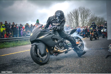 The one we had all been waiting for was finally upon us. The Carey Family Sponsored G Class final saw the Club’s very own Kieran O’Driscoll take on the renowned drag racer and tuner Jarrod Frost in the big one. In my best effort to keep things running smoothly on the grid, all became undone as both bikes lined up on the same side of the track for the finale! Never fear though as it presented the riders 1 chance for a few quick words with John before a coin toss meant Frost would take the left-hand lane for the showpiece. Both men put some rubber down to get tyres up to race pace and crept towards the gates for the big one. Frost who is responsible for the preparation of so many world record breaking bikes as well as drag racing records wouldn’t have it all his own way as the younger of the O’Driscoll brothers was ready to bring the fight to frost. Jarrod’s form in the run up to the final would tell the tale of the final as he was hitting the quarter mile flag on average at less that 9s whereas O’Driscoll would need something very special to improve on his 9.5s average. The Bomber League stealth GSXR pitted against the 1300cc Hayabusa would ultimately be a bridge too far for the black beauty as Frost would get the holeshot and power down towards Ballinhassig in a time of 8.847s and in excess of 190mph making it his second fastest time of the day having beaten Adrian Dorgan in the semi final in a blistering 8.769s. Kieran would finish in a very respectable 9.734s but there was no denying Frost the victory. As the finalists returned to the start line under the marshals it was impossible to miss the smile on Frost’s face behind his lid as he was greeted by the supporters, fans and most notably his right-hand man and son Benji.