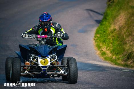 Just before 11am the first machines we're up the road and a few spills led to a disjointed start to proceedings with clean up required on the road but thankfully only a few fairings damaged and riders on their feet as quick as they came off their bikes. Early pace setters in the Quads were Paul Flynn, Diarmuid Barrett and Donie O’Brien all on Yamaha 4-wheelers. The pitbike field was reduced greatly when Donal O’Donovan's machine developed an oil leak on his first run thus ruling himself and his wife Viola out of the running. The man to beat on the twins was undoubtedly Stephen Tobin and he impressed in qualifying and Race 1 to the top spot. The next couple of riders were only separated by a couple of seconds trading places were Jonathan O’Brien, William Roberts and Conor MacCarthy.